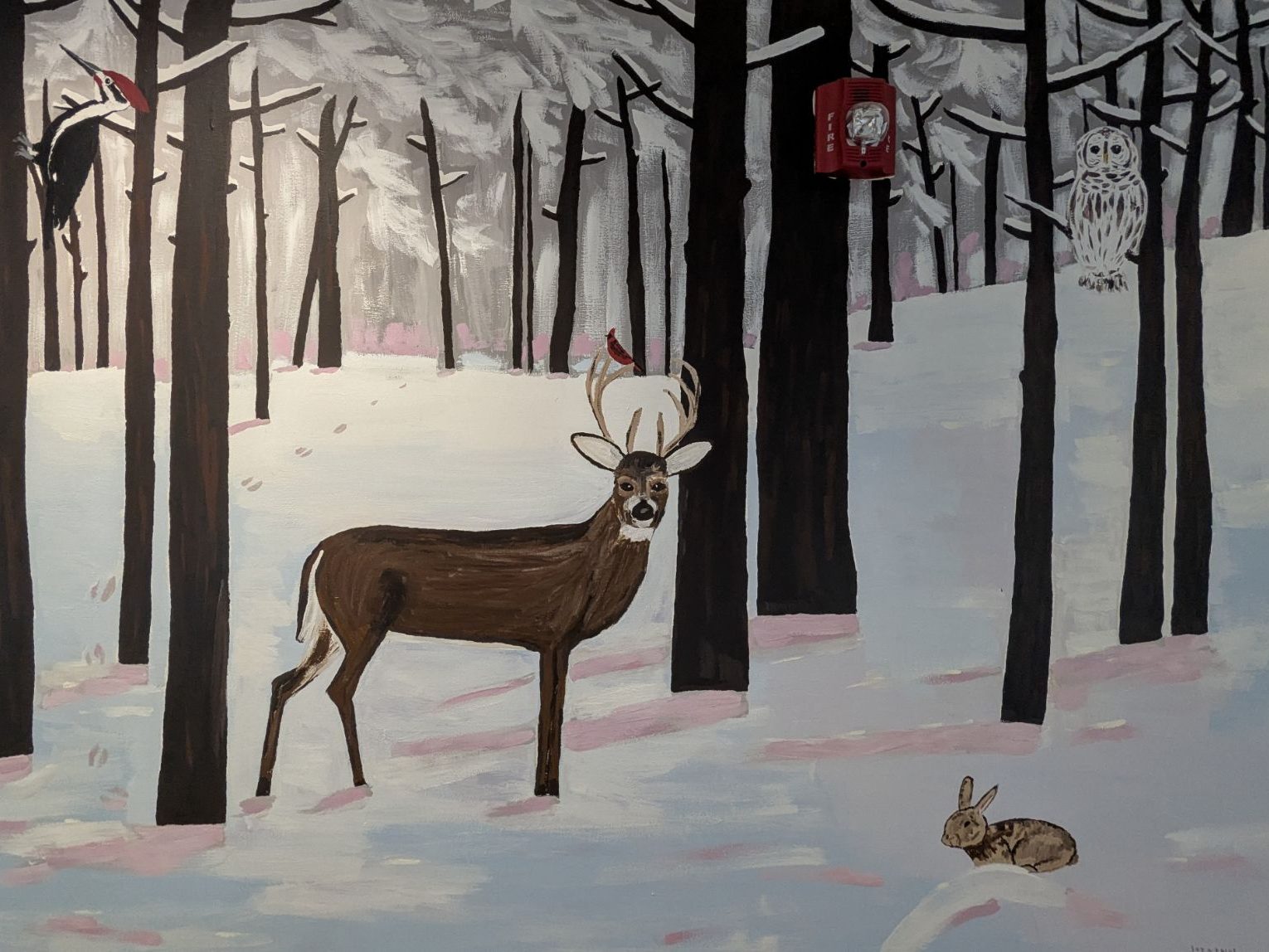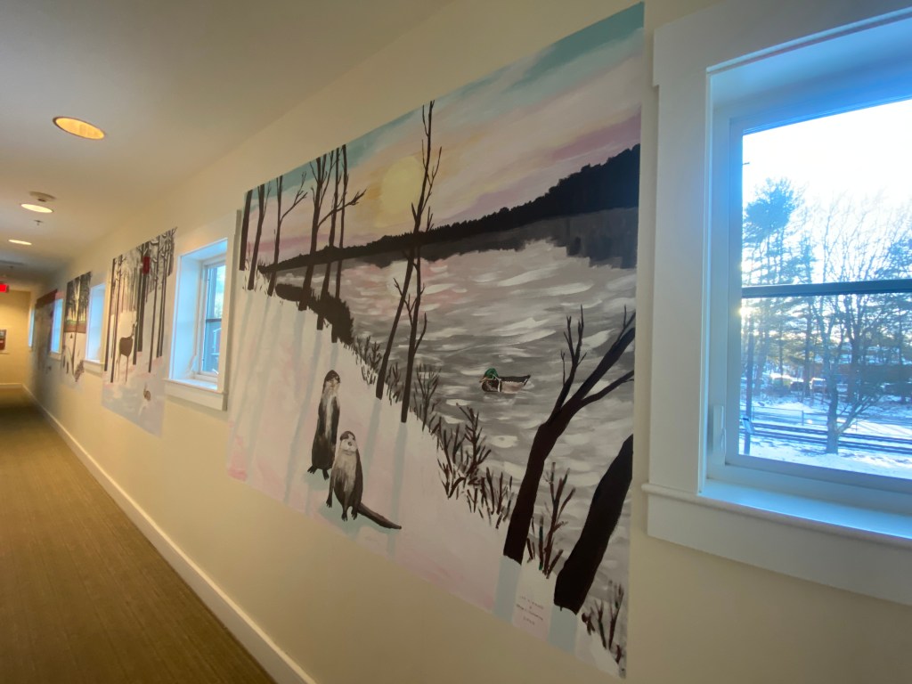 This series of five murals were created in January 2025 along a narrow hallway for a community event. All the scenes were of winter wildlife.